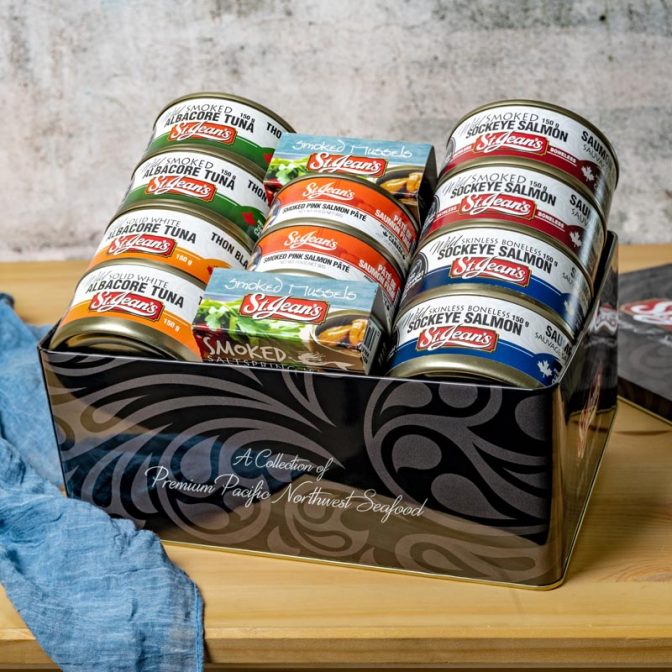 Experience the bountiful flavors of the sea with our Ocean’s Bounty Gift Tin. Indulge in regular and smoked wild sockeye salmon, albacore tuna, smoked Saltspring Island mussels, and wild salmon paté for a luxurious seafood treat.