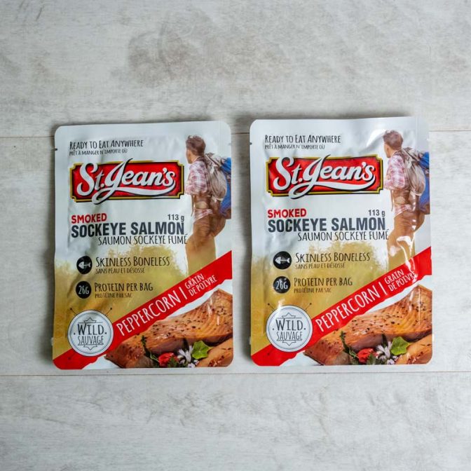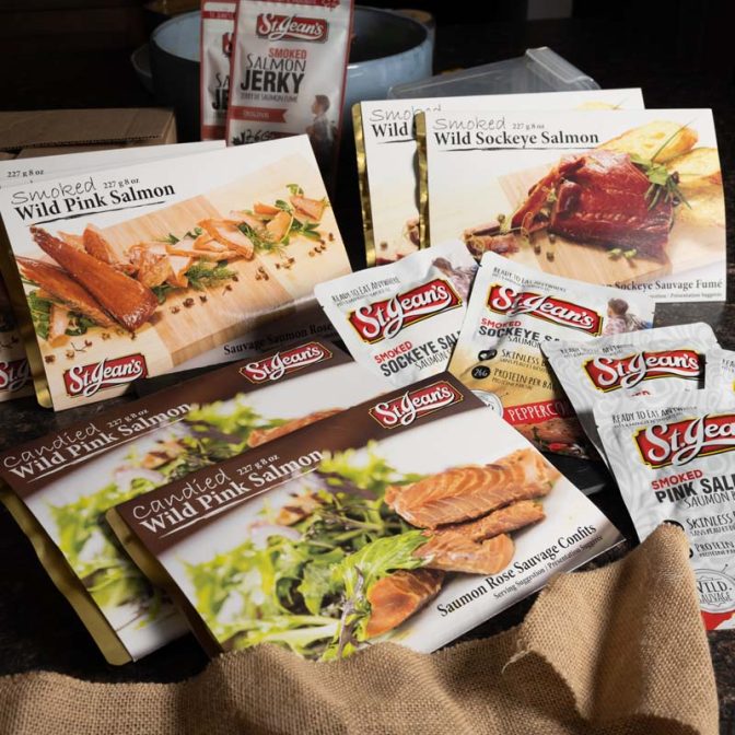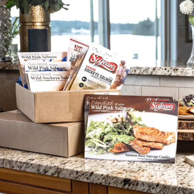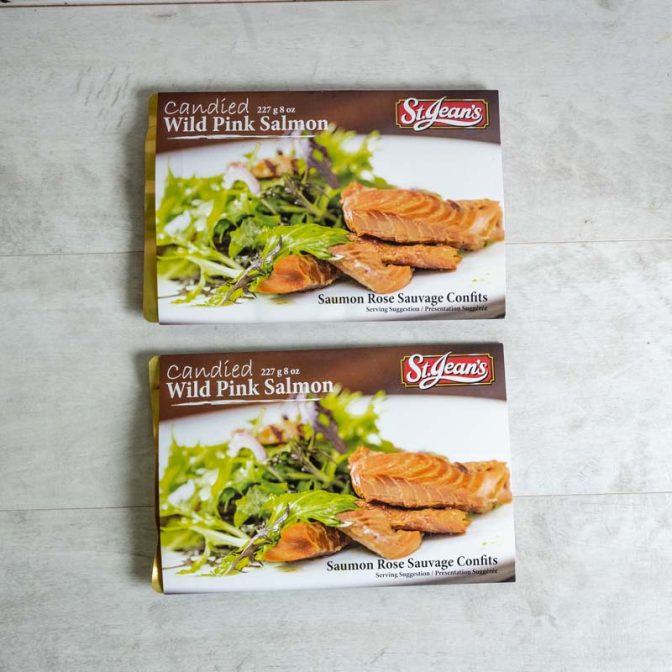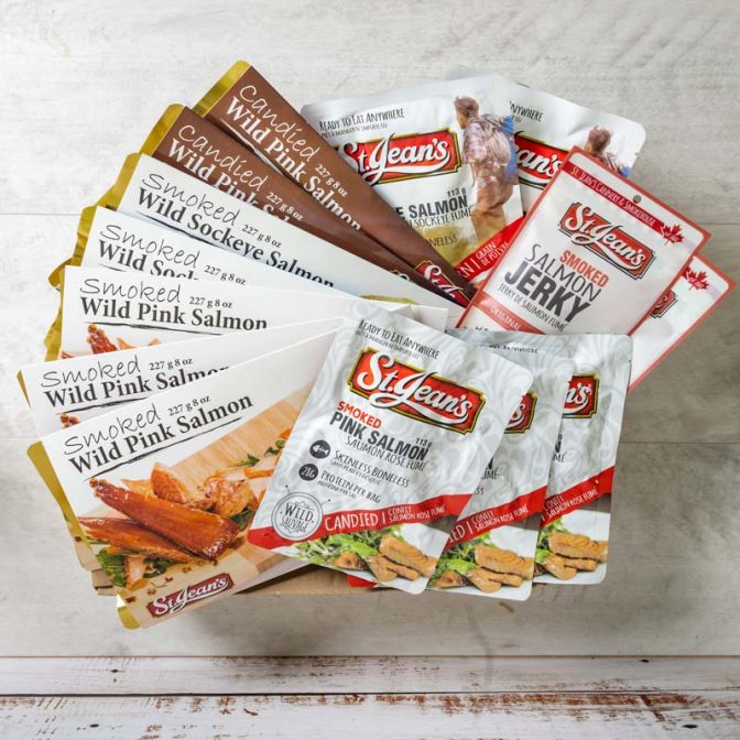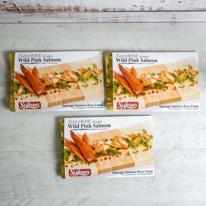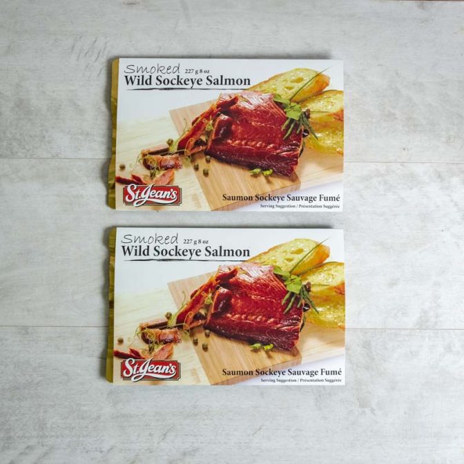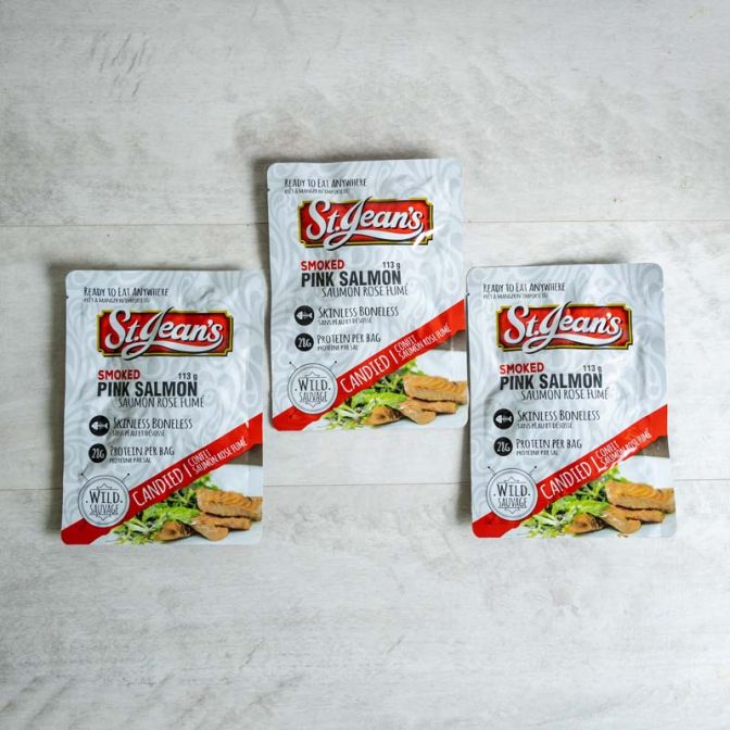 St. Jean’s Peppercorn Hot Smoked Wild Salmon is prepared in the classic hot-smoked style (also known as barbeque style) that seafood fans all over the world crave. We cure our fish with a special mix of spices including peppercorns before smoking it at a high temperature. Rich, flavourful salmon smoked to perfection with a bite of pepper!